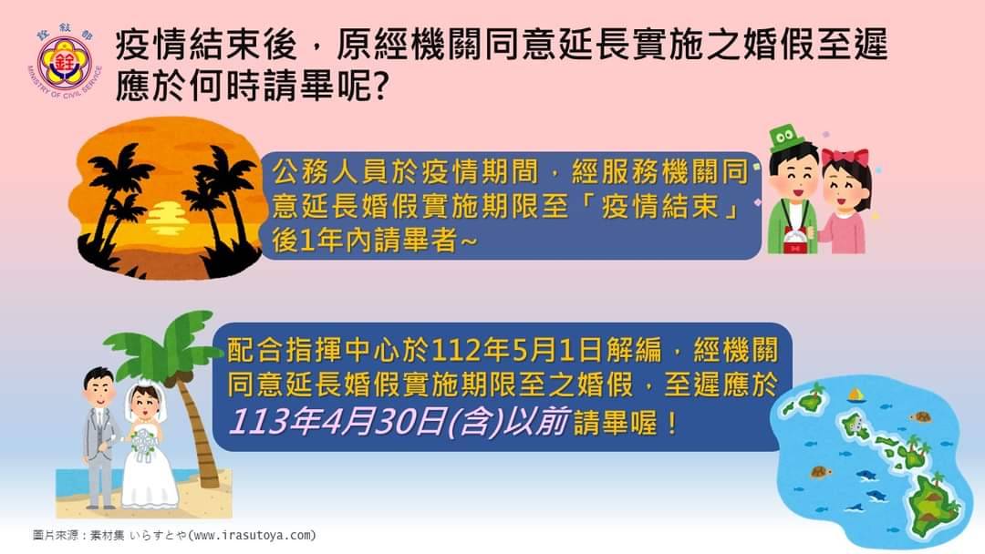 🎯依據銓敘部112年5月5日部法二字第1125570873號函釋規定,配合指揮中心解編,公務人員前經機關同意延長婚假實施期限至疫情結束後1年內請畢者,至遲應於113年4月30日(含)以前請畢喔❗️ 🥰